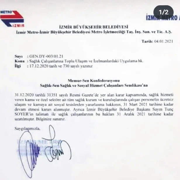 Birinci yazı: Ücretsiz İZMIR Büyükşehir Belediyesi'nin ulaşım şirketi İzmir Metro A.Ş, 4 Ocak'ta Sağlık Emekçileri Sendikası'na yazı göndererek, sağlık çalışanlarına toplu ulaşım araçlarından ücretsiz yararlanma hakkının Başkanı Tunç Soyer'in talimatı ile 30 Haziran'dan 31 Aralık 2021 tarihine kadar uzatıldığını duyurdu. Büyükşehir Belediyesi'nin bu kararı İzmir'de özel ve kamu hastanelerinde görev yapan 50 bin sağlık çalışanı arasında büyük sevinç yarattı.