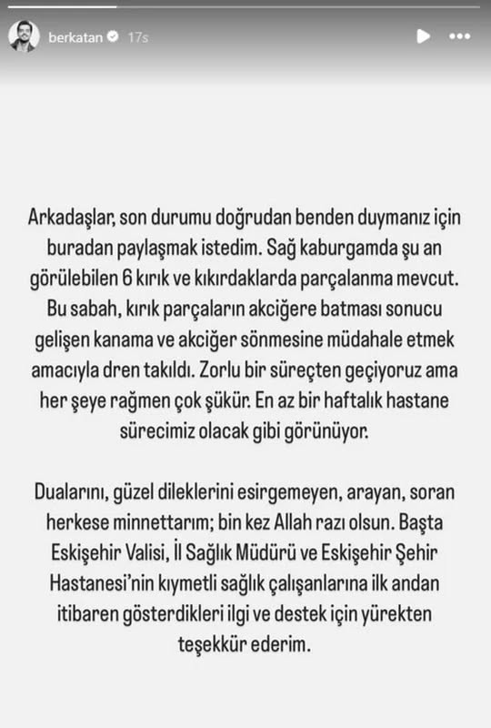 Araçta yolcu olarak bulunan ve hastaneye kaldırılan oyuncu Berk Atan, sağlık durumuyla ilgili yeni bir açıklama yaptı.