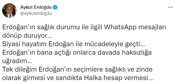 CHP İstanbul Milletvekili Aykut Erdoğdu, kişisel Twitter hesabında yaptığı paylaşımda Cumhurbaşkanı Recep Tayyip Erdoğan'ın sağlık durumuna ilişkin bir iddiaya yer verdi.