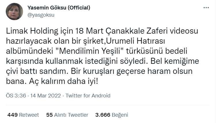Twitter'dan paylaşım yapan Göksu, "Limak Holding için 18 Mart Çanakkale Zaferi videosu hazırlayacak olan bir şirket,Urumeli Hatırası albümündeki "Mendilimin Yeşili" türküsünü bedeli karşısında kullanmak istediğini söyledi. Bel kemiğime çivi battı sandım," dedi.