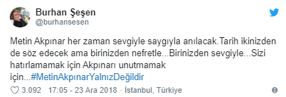 Cumhurbaşkanı Erdoğan'ın Müjdat Gezen ve Metin Akpınar'a yönelik üslubunu da eleştiren Burhan Şeşen, diğer mesajında, "Metin Akpınar her zaman sevgiyle saygıyla anılacak.Tarih ikinizden de söz edecek ama birinizden nefretle...Birinizden sevgiyle...Sizi hatırlamamak için Akpınarı unutmamak için" ifadeleri kullandı.