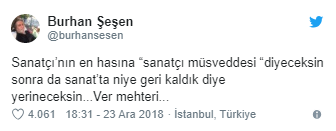 Twitter hesabından yayınladığı mesajlarla Erdoğan'ın 'Sanatçı müsveddesi' sözlerini eleştiren müzisyen Burhan Şeşen, "Sanatçı’nın en hasına 'sanatçı müsveddesi' diyeceksin sonra da sanat’ta niye geri kaldık diye yerineceksin...Ver mehteri" dedi.