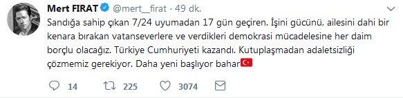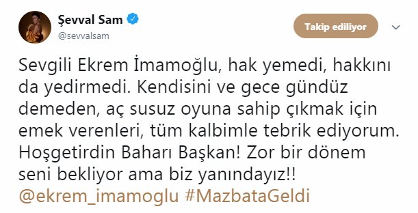 İstanbul Büyükşehir Belediye Başkanı Ekrem İmamoğlu’nun dün mazbatasını almasının akabinde görevine başlamasının ardından yaşanılan heyecan sanatçıları da sardı. Birçok sanatçı, sosyal medya hesaplarından İmamoğlu’nu kutladı. Mesajlarda bahar vurgusu dikkat çekti.