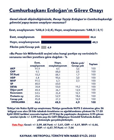 MetroPOLL Araştırma'nın son seçim anketi sonuçlarına göre Cumhurbaşkanı Erdoğan'ın görev onayının yüzde 50'nin altını gördüğü ortaya çıktı…