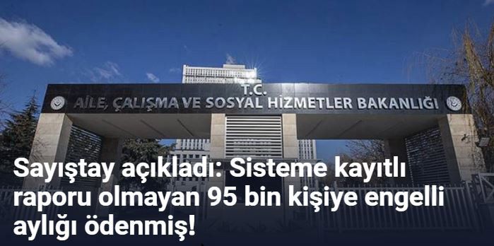 Sayıştay denetçileri, Aile, Çalışma ve Sosyal Hizmetler Bakanlığı’ndan alınan 2019 yılı engelli aylık aylığı, engelli aylığı, engelli yakını aylığı ödemelerine ilişkin veriler ile Sağlık Bakanlığı’ndan alınan engelli sağlık kurulu raporları verilerini karşılaştırdı. VERA isimli program kullanılarak yapılan karşılaştırma sonucunda, Sağlık Bakanlığı sisteminde kayıtlı kurul raporu olmadığı halde 95 bin 917 kişiye engelli aylığı ödendiği ortaya çıktı.