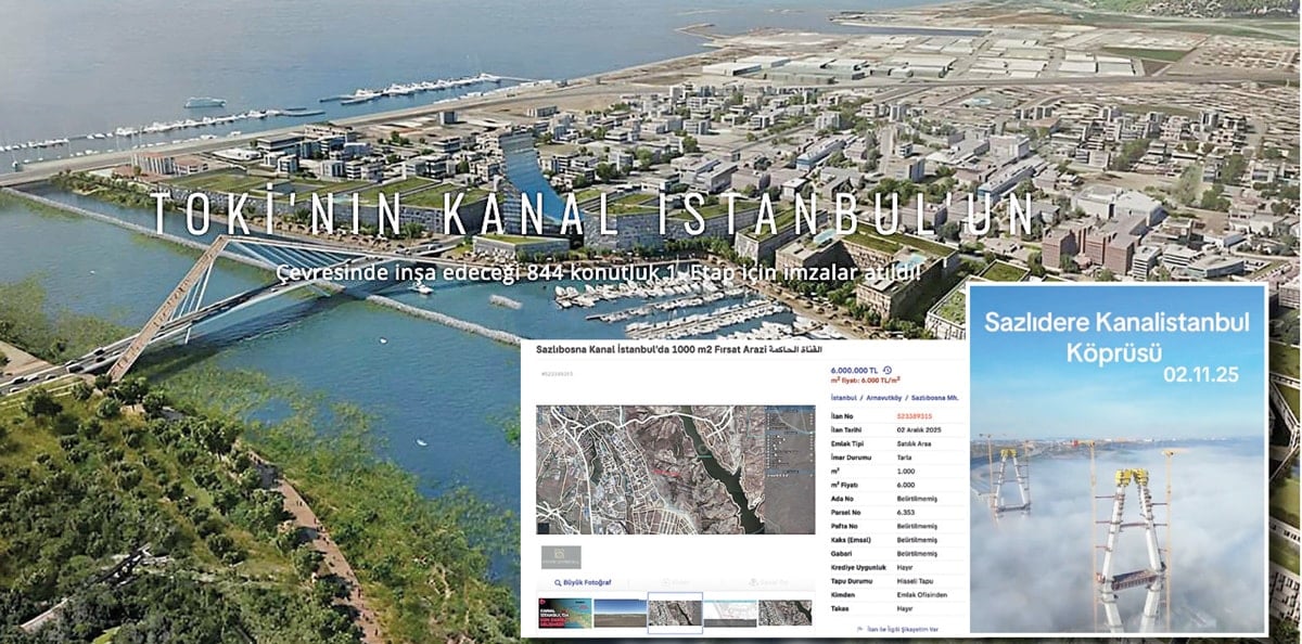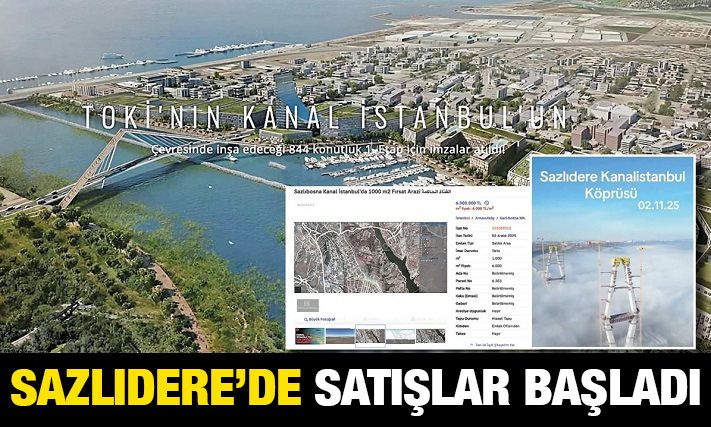 Kuzey Marmara Otoyolu bağlantı köprüsü olan ve Kanal İstanbul’un köprülerinden biri olduğu söylenen Sazlıdere Köprüsü’nü ‘Yenişehir kuruluyor’ başlığıyla pazarlayan emlakçılar, arsaların metrekaresini 6 bin liraya satıyor. İmar gelen arsalara “Kanal İstanbul’u panoramik olarak görür. Ek olarak Hadımköy sanayinin yanı başında... Kaçmaz kupon arsa, detaylar için arayınız” şeklinde pazarlanırken, tapu durumu ise hisseli olarak açıklandı. İlanda, Rönesans Holding’in yaptığı paralı otoyolun köprüsü de kullanıldı.