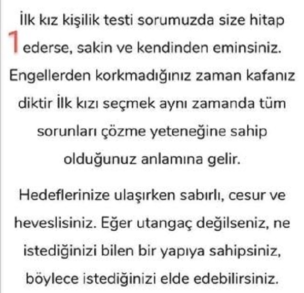 İlk kız kişilik testi sorumuzda size hitap ederse, sakin ve kendinden eminsiniz. Engellerden korkmadığınız zaman kafanız diktir İlk kızı seçmek aynı zamanda tüm sorunları çözme yeteneğine sahip olduğunuz anlamına gelir.