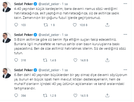 Geçen pazar günü 15 gün süreyle video yayımlayacağını duyuran Peker, kendisine "namus sözü" verdiğini hatırlatanlara da "Akit yaptığımızı hatırlatacağınıza, siz de akitinize sadık kalın. Zamanınızın bir çoğunu fuzuli işlerde geçiriyorsunuz. Bizim akitimize göre siz benim ifşa ettiğim suçları takip edecektiniz. Bunlarla ilgili muhalefete ve namus sahibi olan basın kuruluşlarına baskı yapacaktınız. Ben de size akitimizi hatırlatmak isterim. Siz de verdiğiniz sözü tutun" yanıtını verdi.