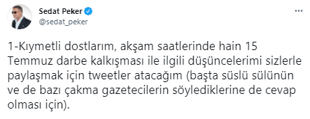 1Kıymetli dostlarım, akşam saatlerinde hain 15 Temmuz darbe kalkışması ile ilgili düşüncelerimi sizlerle paylaşmak için tweetler atacağım (başta süslü sülünün ve de bazı çakma gazetecilerin söylediklerine de cevap olması için)