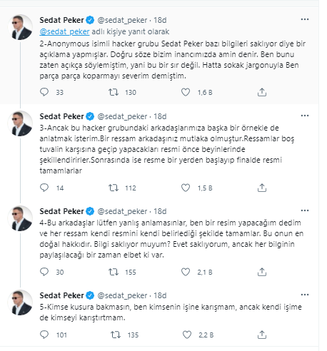 Sedat Peker, "Anonymous isimli hacker grubu Sedat Peker bazı bilgileri saklıyor diye bir açıklama yapmışlar. Doğru söze bizim inancımızda amin denir." ifadelerini kullandı.
