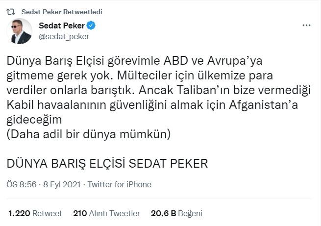 Organize suç örgütü lideri Sedat Peker attığı son tweette Cumhurbaşkanı ve AKP Genel Başkanı Recep Tayyip Erdoğan'ın kitabına isim vermeden değindi ve Kabil'e gidiyorum dedi.