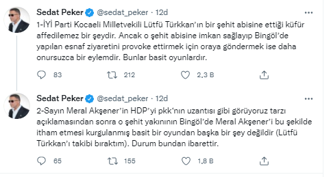 Peker, 'Sayın Meral Akşener’in HDP’yi pkk‘nın uzantısı gibi görüyoruz tarzı açıklamasından sonra o şehit yakınının Bingöl’de Meral Akşener’i bu şekilde itham etmesi kurgulanmış basit bir oyundan başka bir şey değildir (Lütfü Türkkan’ı takibi bıraktım). Durum bundan ibarettir.' diyerek tepki gösterdi.