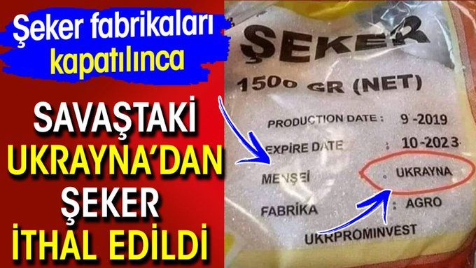 Kimi 2018'de özelleştirildi, kimi ise daha sonra satılığa çıkarıldı. Türkiye'de faaliyette bulunan 33 şeker fabrikasından 25'i Türkşeker'e aitti. O fabrikalardan 13 2018'de tam anlamıyla satılarak özelleştirildi. O fabrikaların arazilerinden tutun herşeyi satıldı. Hal böyle olunca sonuçları da yeni yeni yansımaya başladı. İşte o yansımada şeker ithalatıyla kendini gösterdi. Savaştaki Ukrayna'dan şeker ithal edildi. 1,5 Kiloluk poşettin üzerinde "Şeker" yazıyor. Bunun yanında Gramın kısaltılması "Gr''...Menşei de yazıyor. Ukrayna. Görüntüyü paylaşan sosyal medya kullanacısı da eklemiş. "Ukrayna'dan şeker gelmiş. Türkiyem" diye