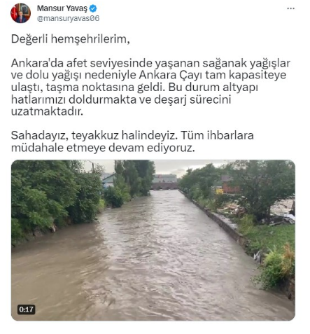 Ankara'da şiddetli sağanak yağış ve dolu seli de beraberinde getirirken, Büyükşehir Belediye Başkanı Mansur Yavaş kritik bir uyarıda bulundu. Yavaş, "Ankara'da afet seviyesinde yaşanan sağanak yağışlar ve dolu yağışı nedeniyle Ankara Çayı tam kapasiteye ulaştı, taşma noktasına geldi. Bu durum altyapı hatlarımızı doldurmakta ve deşarj sürecini uzatmaktadır." dedi.