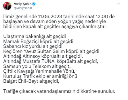 Ankara Valisi Vasip Şahin, sosyal medya hesabından yaptığı paylaşımda saat 12.00'de başlayan ve devam eden yoğun yağışlar nedeniyle bazı alt geçitlerin trafiğe kapatıldığını bildirdi. Şahin, şunları kaydetti: "Ulaştırma Bakanlığı, Mamak Boğaziçi köprü, Sabancı Kız Yurdu, Keçiören Yavuz Sultan Selim Köprüsü, Altındağ Altınsoy Köprü altı, Altındağ Mustafa Tuna, Samsun yolu Telekom, Çiftlik Kavşağı Yenimahalle yönü, Kurtuluş Trafik Ekipler Amirliği önü, Balgat Ehli-Beyt altgeçidi yönünde trafiğe çıkacak vatandaşlarımızın dikkatine sunulur. Söz konusu bölgelerdeki olumsuzlukların giderilmesi için ekipler, yoğun bir şekilde çalışmalarını sürdürmektedir."