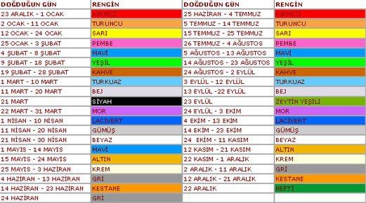Renklerin insan psikolojisi üzerindeki etkisi artık kanıtlanmış bir gerçek! Giydiğimiz kıyafet ya da evimizde kullanmayı sevdiğimiz renkler bizi iyi ya da kötü etkiliyor. Peki ya doğduğumuz gün ve renkler arasında da etkili bir bağlantı olduğunu söylersek?.. Doğduğunuz tarihe göre hangi renk olduğunuzu bulun ve özelliklerine bakın. Tanıdık gelecek...