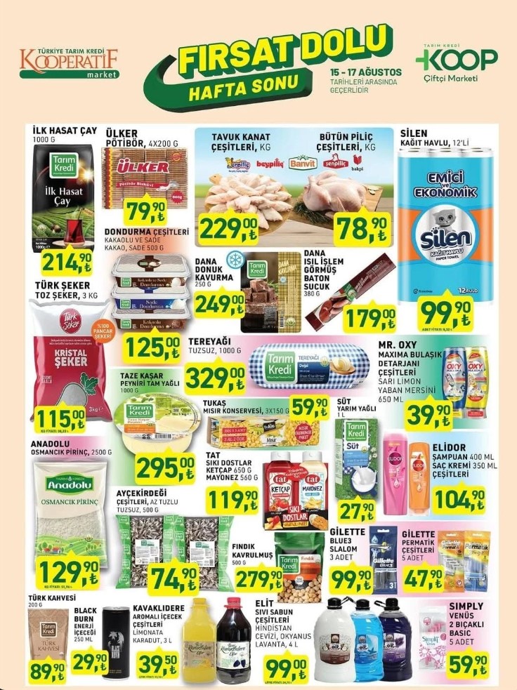 Tarım Kredi Market, 15-17 Ağustos tarihleri arasında geçerli hafta sonu kampanyasını duyurdu. Çay, şeker, tavuk, kaşar, deterjan ve sıvı sabun gibi ürünler bu hafta sonu indirimli fiyatlarla raflarda olacak. İşte Tarım Kredi hafta sonu fırsatları ve güncel aktüel ürünler listesi…