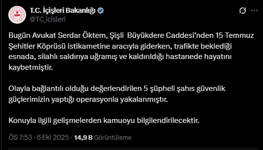 Sinan Ateş cinayeti davasında bir dönem tutuklu yargılandıktan sonra tahliye edilen Avukat Serdar Öktem, İstanbul Şişli Büyükdere Caddesi’nde saat 16.00 civarında uzun namlulu silahlarla suikasta uğradı. Öktem hastaneye kaldırıldı ancak müdahalelere rağmen hayatını kaybetti. İstanbul Emniyet Müdürlüğü ekiplerince düzenlenen operasyonda silahlı saldırıya ilişkin 5 şüpheli yakalandı. Şüpheliler işlemleri için emniyete götürüldü.