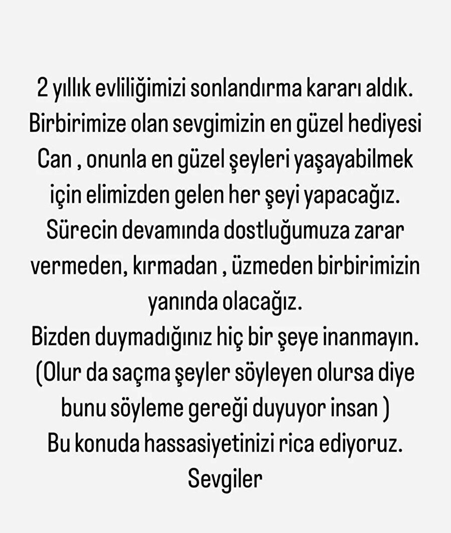 “2 yıllık evliliğimizi sonlandırma kararı aldık. Birbirimize olan sevgimizin en güzel hediyesi Can, onunla en güzel şeyleri yaşayabilmek için elimizden gelen her şeyi yapacağız. Sürecin devamında dostluğumuza zarar vermeden, kırmadan, üzmeden birbirimizin yanında olacağız.”