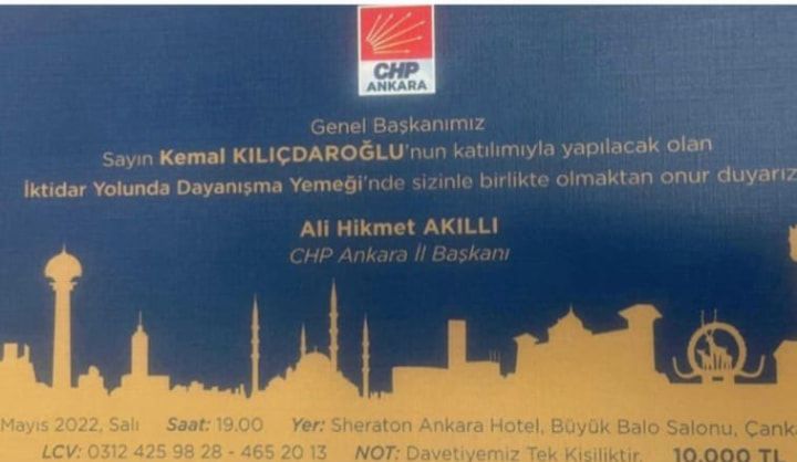 Yemek meselesinden devam edelim. Kemal Bey’in bu konuşmayı yaptığı yemeğe katılım bedeli 10 bin lira! Evet, yanlış duymadınız. CHP liderine daha yakın masada oturmak isteyenler için farklı bir ücret tarifesi bile uygulanmış o akşam!