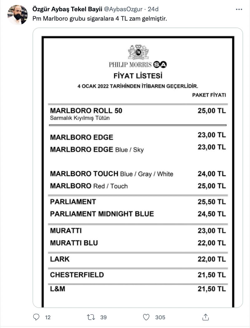 Buna göre, PM grubunda 21,5 liradan ucuz sigara kalmadı. En pahalı sigara ise 25,5 liraya yükseldi.