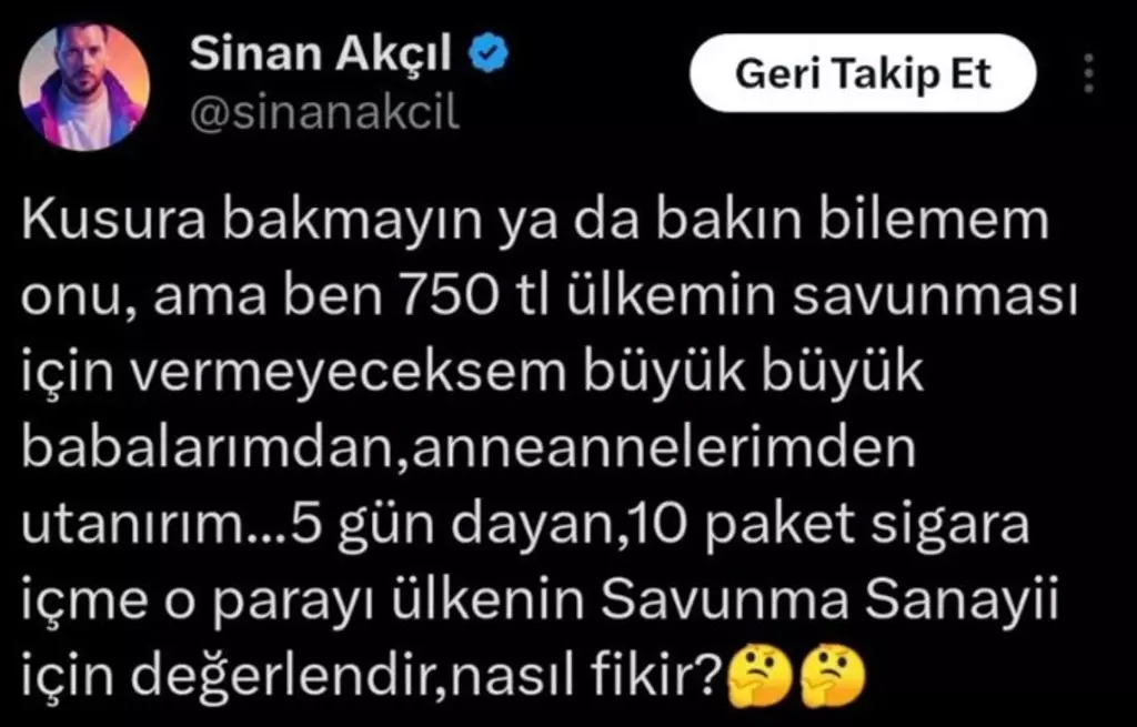 Bu tartışmalara ünlü şarkıcı Sinan Akçıl da dahil oldu. Akçıl, sosyal medya platformu X üzerinden yaptığı açıklamada kredi kartlarına getirilen 750 liralık ek vergiyi savunarak, "Kusura bakmayın ya da bakın bilemem onu, ama ben 750 TL’yi ülkemin savunması için vermeyeceksem, büyük büyük babalarımdan, anneannelerimden utanırım...