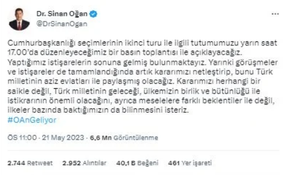 Oğan’ın tweetinde kullandığı istikrar kelimesi dikkat çekti ve Sinan Oğan'ın Cumhur İttifakı'nın destekleyeceği şeklinde yorumlandı. Çünkü Erdoğan’ın da istikrar kelimesine sıkça kıllandığı biliniyor. Oğan’ın bu paylaşımının ardından “Acaba Erdoğan’ı mı desktekleyecek” düşüncesi doğdu.