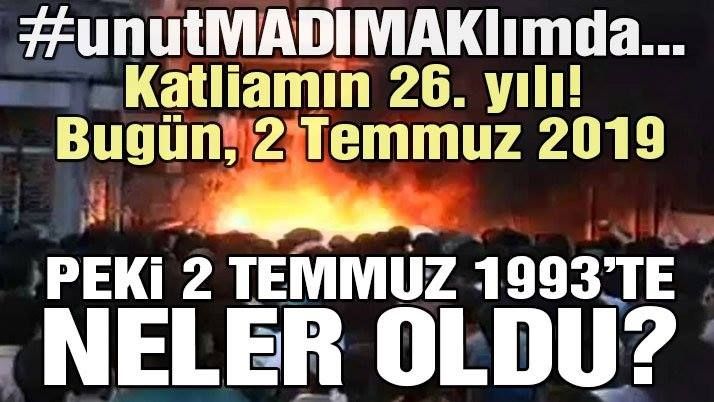 Sivas’ta Pir Sultan Abdal Kültür Derneği tarafından organize edilen Pir Sultan Abdal Şenlikleri sırasında Madımak Oteli’nin yakılması sonucunda çoğunluğu Alevi 33 yazar, ozan, düşünür ile 2 otel çalışanının yanarak ya da dumandan boğularak hayatlarını kaybetti.