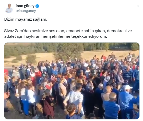 Güney, “Bizim mayamız sağlam. Sivaz Zara'dan sesimize ses olan, emanete sahip çıkan, demokrasi ve adalet için haykıran hemşehrilerime teşekkür ediyorum” dedi.