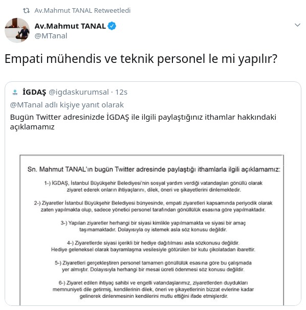 CHP İstanbul Milletvekili Mahmut Tanal’ın paylaştığı iddialara ilişkin yazılı bir açıklama yapan İGDAŞ, “iddialara konu olan ziyaretlerin İstanbul Büyükşehir Belediyesi bünyesinde, empati ziyaretleri kapsamında periyodik olarak yapıldığını, sadece yönetici personelin gönüllülük esasına göre katılım gösterdiğini” ileri sürdü. Yapılan ziyaretlerin herhangi siyasi bir kimlikle yapılmadığı ve siyasi amaç taşımadığı savunularak, “Dolayısıyla oy istemek asla söz konusu değildir” denildi.
