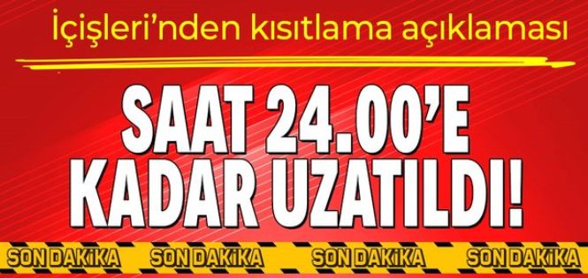 İçişleri Bakanlığı: Yapılandırma kapsamındaki borçların son ödeme süresi bugün saat 24.00'te sona ereceğinden, ödeme yapmak üzere vergi daireleri ile diğer kamu idarelerine gidecek vatandaşlarımız ile ödemelerin yapılması için açık bulundurulacak vergi dairelerinde ve kamu idarelerinde görevli personel, bugün 21.00'de başlayacak sokağa çıkma kısıtlamasından gece saat 24.00'e kadar muaf tutulacaktır.