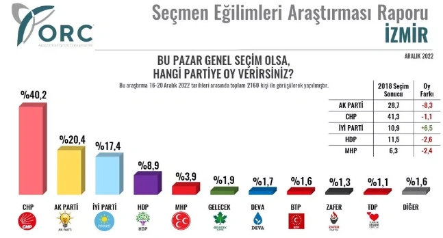 İzmir'de 2018 yılına göre CHP'nin oyu yüzde 1,1 geriledi ve yüzde 40,2 oldu. İYİ Parti son ankete göre İzmir'de oyunu 6,5 puan artırarak yüzde 17,4'e yükseltti.