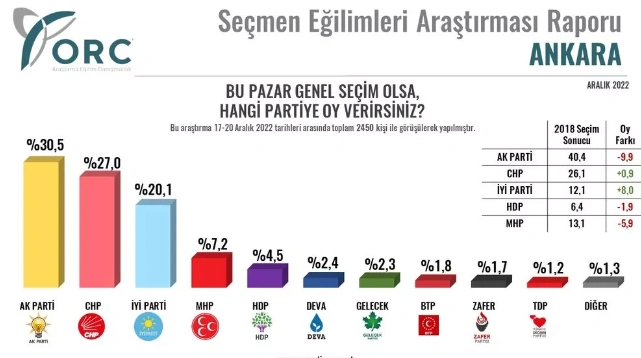 AKP'nin oylarında 2018 yılına göre düşüş Ankara'da da devam etti. AKP'nin oyu son yapılan ankette 2018'e göre 9,9 puan düşüşle yüzde 30,5'e geriledi.