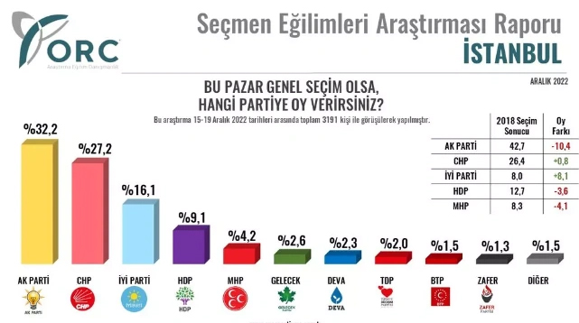 CHP ise İstanbul'da 2018'e göre oyunu 0,8 puan artırdı ve yüzde 27,2'ye yükseltti. İstanbul sonuçlarında İYİ Parti'nin yükselişi de dikkat çekti. 2018 yılına göre oyunu 8 puan artıran İYİ Parti'nin son ankette oyu yüzde 16,1'e yükseldi.