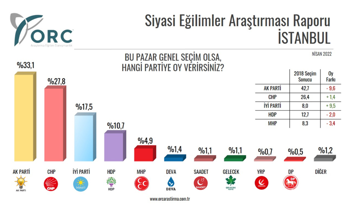 ORC Araştırma şirketi, son seçim anketini sosyal medya hesabı Twitter'dan paylaştı. İstabul'un 3 bölgesinde 7 bin 100 kişiyle görüşülen anket, yüz yüze yapıldı.