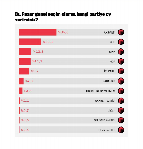 Ankete göre 'Bu pazar seçim olsa' partilerin alacakları oy oranları şu şekilde:
