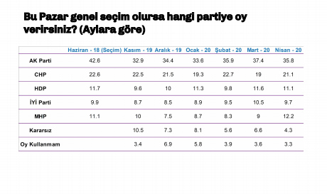 Düzenli olarak ayda 2 kez kamuoyu araştırması yapan İstanbul Ekonomi Araştırma Merkezi, Nisan ayı ikinci yarısına ait araştırmanın sonuçlarını açıkladı. Koronavirüs salgınının ardından 10 Nisan'da ilan edilen ilk sokağa çıkma yasağının ardından yapılan araştırmada, partilerin oy oranı, liderlerin güvenilirlikleri, belediye başkanlarının performansı, koronavirüsün gümlük yaşama etkileri ve Sağlık Bakanlığı'nın günlük olarak açıkladığı koronavirüs vaka ve ölüm sayılarına kadar pek çok soru vatandaşlara yöneltildi.