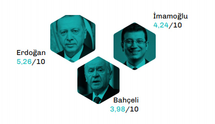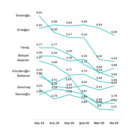 Mart ayına kıyasla puanını 0,19 arttıran Devlet Bahçeli, 3,98 puan ile Mansur Yavaş’ı geçerek üçüncü sırada yer aldı. Mansur Yavaş ise 3,62 puanla dördüncü sıraya geriledi. Mart ayı puanlarına göre, Erdoğan, İmamoğlu ve Yavaş puan kaybı yaşarken, puan kaybının en çok olduğu lider ise 0.28 puan ile Recep Tayyip Erdoğan oldu.