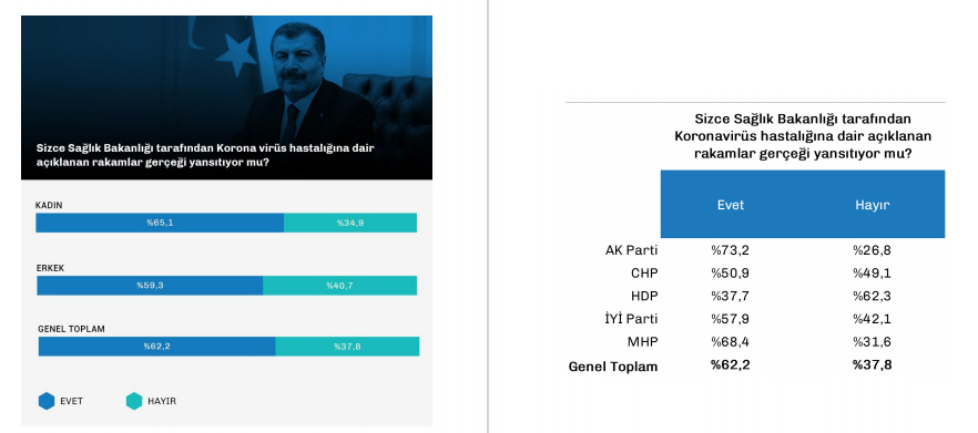 Anketin dikkat çeken bir başka sonucu ise koronavirüs salgını hakkında Sağlık Bakanlığı tarafından yapılan açıklamaların güvenilirlik oranı. Ortalama olarak ankete katılanların yüzde 62.2'si verileri güvenilir bulurken, AKP seçmeninde bu oran yüzde 73.2 olarak çıkıyor. Ancak AKP seçmenini yüzde 26.8'inin açıklanan rakamlara inanmadığı da anketin çarpıcı sonuçlarından biri.