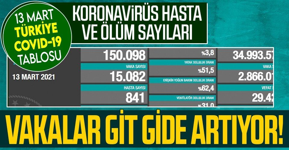 Son 24 saatte yapılan 148 bin 856 testte 14 bin 941 vaka, 834 hasta tespit edildi. Virüs nedeniyle 66 kişi hayatını kaybederken, 11 bin 180 kişi de iyileşti. Bugünkü verilerle toplam test sayısı 34 milyon 843 bin 480, toplam vaka sayısı 2 milyon 850 bin 930, toplam vefat sayısı 29 bin 356, toplam ağır hasta sayısı 1349, toplam iyileşen hasta sayısı ise 2 milyon 670 bin 273 oldu. Tabloda haftalık oranlar ise hastalarda zatürre oranı yüzde 3,8, yatak doluluk oranı yüzde 51,5, erişkin yoğun bakım doluluk oranı yüzde 62,4, solunum cihazına bağlı (ventilatör) doluluk oranı yüzde 31,0, ortalama temaslı tespit süresi 8 saat, filyasyon oranı yüzde 99,9 şeklinde yer aldı. 12 MART KORONAVİRÜS TABLOSU 11 MART KORONAVİRÜS TABLOSU