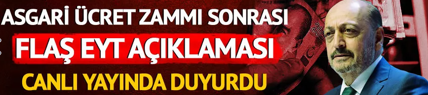 Son dakika: Milyonların beklediği asgari ücret zammı açıklandı. Cumhurbaşkanı Erdoğan, asgari ücretin, yüzde 30'luk zam yapılarak 5 bin 500 TL'ye çıktığını duyurdu. Söz konusu zam gelişmesi sonrası canlı yayına katılan Çalışma ve Sosyal Güvenlik Bakanı Vedat Bilgin, söz konusu ara zammı değerlendirdi. "Enflasyonist ortamda emekçileri koruyan bir düzenleme yapıldı" diyen Bakan Bilgin EYT konusuyla ilgili de önemli açıklamalarda bulundu.