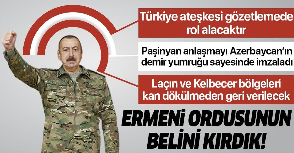 Azerbaycan ve Ermenistan arasında yaklaşık 1,5 aydır süren Dağlık Karabağ çatışması sona erdi. Türkiye saati ile 00.00'da ateşkesin başladığı duyuruldu. Azerbaycan Cumhurbaşkanı İlham Aliyev, anlaşmanın ardından 'Ulusa sesleniş' konuşması yaptı, çatışmalar ve anlaşma hakkında bilgi verdi. Canlı yayında Dağlık Karabağ çatışmasına yapılan anlaşma ile son verildiğini ifade eden Aliyev, Ermenistan Başbakanı Nikol Paşinyan'ın bu anlaşmayı kendi isteğiyle değil, Azebercan'ın 'demir yumruğu' sayesinde imzaladığını söyledi.