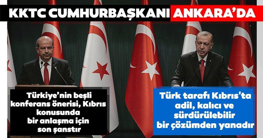 KKTC Cumhurbaşkanı seçildikten sonra davetiniz üzere Ankara'da bulunmaktan, iki kardeş devletin ortak konularını ele almaktan son derece memnunum. Türkiye bizim kardeş vatanımız olmanın yanı sıra ana vatanımızdır. Türkiye 15 Temmuz 1974'te Kıbrıs Helen Cumhuriyeti'nin ilan edilmesinin ardından garantörlük hakkını kullanarak harekete geçseydi ne olurdu, düşünülmelidir. Sayın Cumhurbaşkanım, Türkiye ve KKTC, Kıbrıs konusunun adil ve kalıcı bir anlaşma sağlanması için pek çok kez üzerine düşeni yapmaya çalışmıştır. Rum tarafı hala 1974 öncesine geri dönmenin hayali içerisindedir. Türkiye'nin ortaya koyduğu 5'li konferans önerisi bize göre bir son şanstır. Doğu Akdeniz'deki gelişmelerin ele alınması için KKTC'nin de bir konferans toplaması önerisi bize göre son derece gerçekçi ve yapıcıdır. Hidrokarbonlar konusu Kıbrıs Rum tarafı için bir samimiyet testidir.