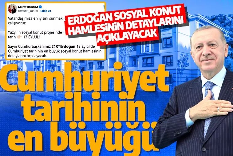 "Yüzyılın sosyal konut projesinde tarih 13 Eylül." bilgisini veren Kurum, "Sayın Cumhurbaşkanımız Recep Tayyip Erdoğan 13 Eylül'de Cumhuriyet tarihinin en büyük sosyal konut hamlesinin detaylarını açıklayacak." ifadesini kullandı.