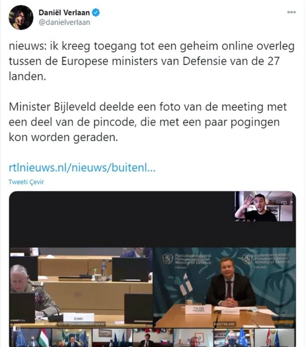 Zoom toplantı kodunun yansımasını Savunma Bakanı Ank Bijleveld'in ekranında gördüğünü ve birkaç denemeden sonra kolayca toplantıya katıldığını anlatan gazetecinin bu paylaşımıyla birlikte Ank Bijleveld'in Tweet'inin silindiği de dikkatlerden kaçmadı.