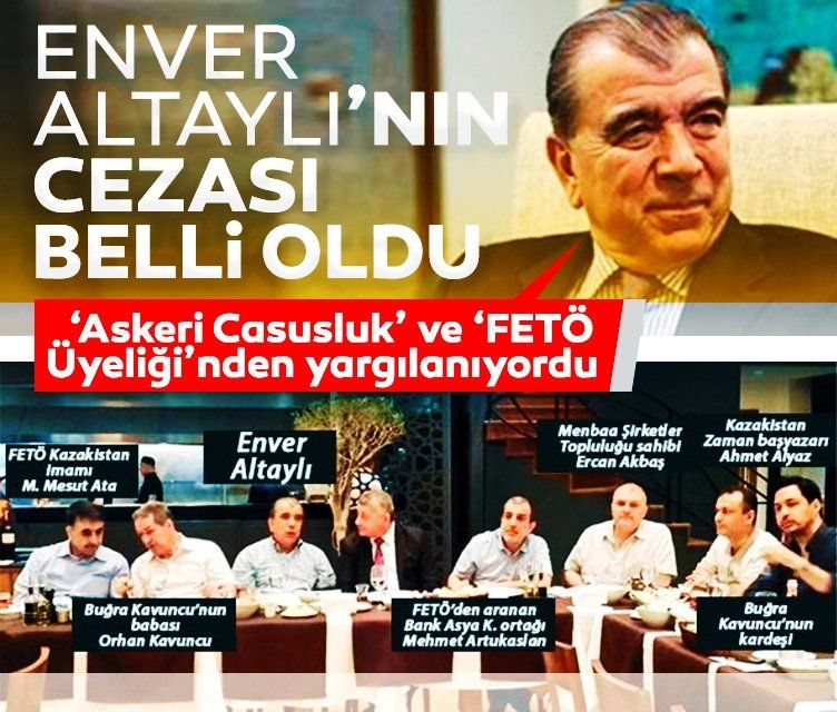 Enver Altaylı'ya 'Silahlı terör örgütle üye olmak' suçundan 10 yıl 'Siyasi ve askeri casusluk' suçundan 13 yıl 4 ay hapis cezası verildi. Eski İstihbaratçı Mehmet Barıner'e ise 'Silahlı terör örgütüne üye olmak' suçundan 8 yıl 9 ay, 'Siyasi ve askeri casusluk' suçundan 12 yıl 6 ay hapis cezası verildi.