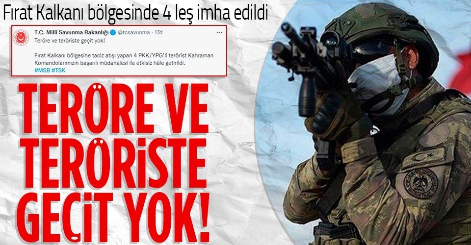 Açıklamada, "Teröre ve teröriste geçit yok! Fırat Kalkanı bölgesine taciz atışı yapan 4 PKK/YPG'li terörist Kahraman Komandolarımızın başarılı müdahalesi ile etkisiz hâle getirildi" ifadelerine yer verildi.
