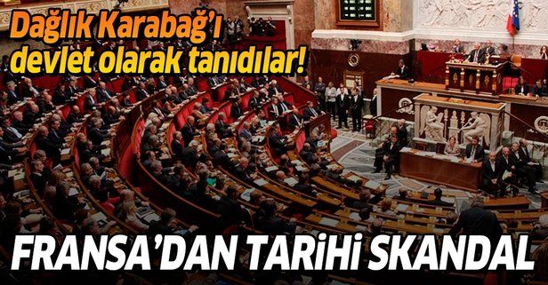 Fransa'da Senato'nun ardından Parlamento da skandal bir karara imza attı. Fransa'da Senato'dan sonra Ulusal Meclis de, hükümete, sözde "Dağlık Karabağ Cumhuriyeti'ni" tanıması çağrısında bulunan kararı onayladı. Meclis'te sembolik değere sahip karar, 3 "hayır" oyuna karşı 188 "evet" oyuyla kabul edildi. 16 milletvekili ise çekimser oy kullandı. TÜRKİYE'NİN AB ÜYELİĞİNE TAŞ KOYMA ÇABASI Fransız hükümetinden Avrupalı ortaklarıyla Dağlık Karabağ bölgesine insani yardımları ulaştırması istendiği belirtilen kararda, Fransız hükümetine "Türkiye'nin Dağlık Karabağ ihtilafındaki rolü nedeniyle Avrupa Birliği'ne (AB) üyelik sürecini Avrupalı ortaklarıyla yeniden değerlendirmesi" çağrısında bulunuldu. FRANSIZ HÜKÜMETİNE ÇAĞRI YAPTILAR FRANSA, ERMENİSTAN'A DESTEK VERMEKLE ELEŞTİRİLİYOR Söz konusu karar kabul edilmesine karşın, Azerbaycan ile Ermenistan arasında imzalanan ateşkes anlaşmasında, Dağlık Karabağ'ın statüsünü belirten unsur bulunmuyor. Ayrıca Birleşmiş Milletler'e (BM) göre, Dağlık Karabağ, Azerbaycan toprağı olarak kabul ediliyor. Meclis ve Senato'nun bu yönde karar kabul etmesinde Ermeni lobisinin etkisi olduğu değerlendiriliyor. Fransa, AGİT Minsk Grubu Eş Başkanı ülkelerden biri olarak Dağlık Karabağ sorununda tarafsızlığını yitirmekle ve Ermenistan'a destek vermekle eleştiriliyor.