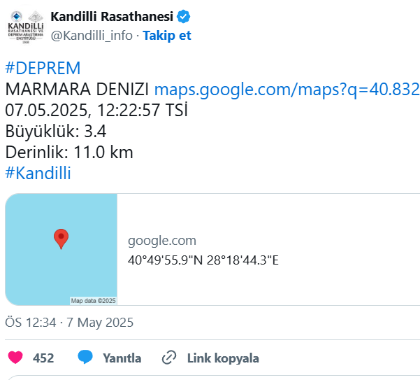 Aynı bölgede bu sabah saat, 08.07'de 3.1 büyüklüğünde deprem meydana gelmişti.
