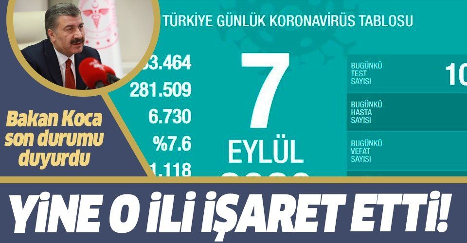 Son dakika haberleri... Türkiye korona virüsle mücadelede aldığı önlemlerle vaka sayısını kontrol altında tutmaya devam ediyor. Sağlık Bakanı Fahrettin Koca da her gün koronavirüs vaka ve vefat sayılarını son dakika olarak duyuruyor. Vatandaşların merakla beklediği 7 Eylül corona virüs tablosu Bakan Koca tarafından açıklandı. İşte, Türkiye'de 7 Eylül koronavirüs vaka ve vefat sayıları tablosu...